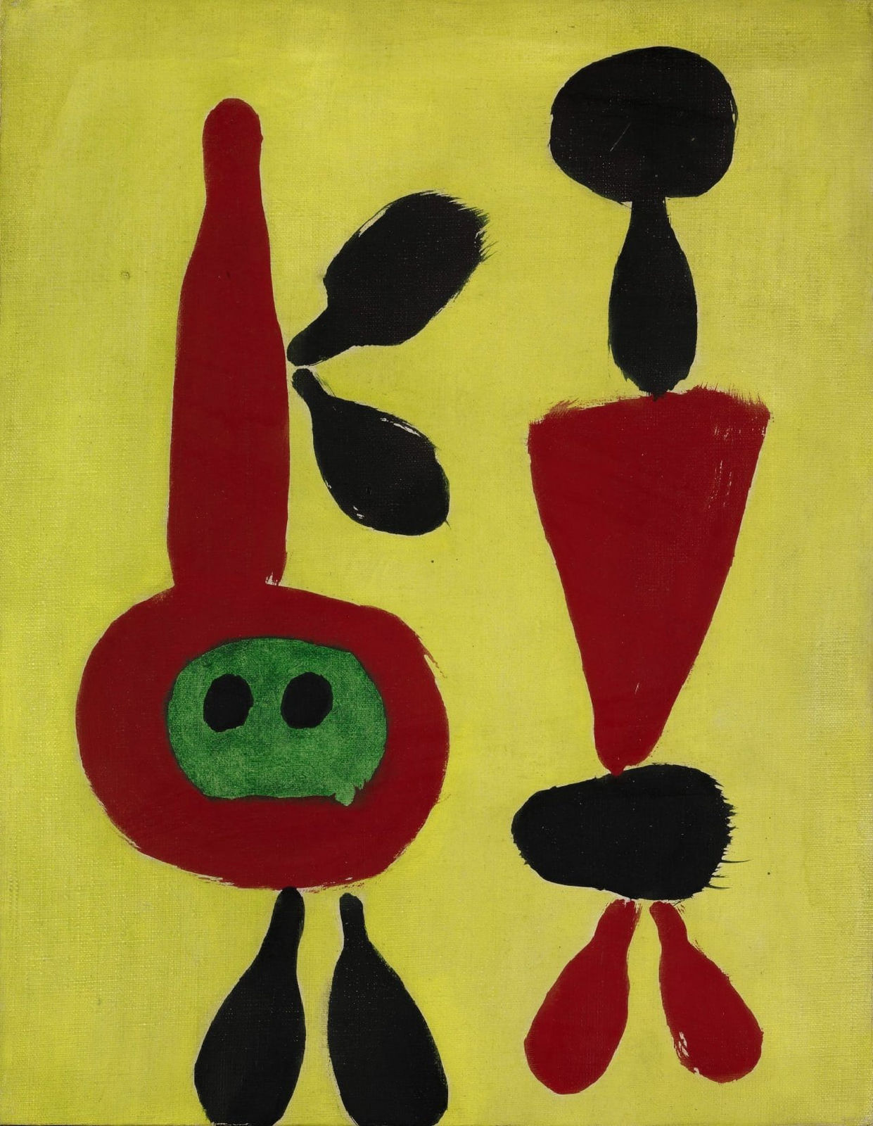 En cinq salles, en évitant les catégories (cubisme, surréalisme, abstraction…) et, après sa période surréaliste des années 1920, en montrant la formation de son langage, avec ses figures humaines noires, marquées par la Guerre d’Espagne. Ensuite, dans les années 1950, quand ce noir revient, c’est lié à d’autres motifs, à son engouement pour la calligraphie chinoise. Enfin, les années 1960 et 1970 présentent des sculptures, bronzes peints de couleurs terriennes, et des œuvres sur papier aux couleurs primaires, rouge, blanc, bleu, qu’il décline magnifiquement.